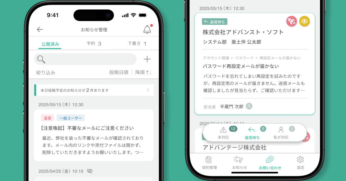 お知らせの予約や下書き機能を用意し、外出先でも柔軟に情報を発信できるようにしました。